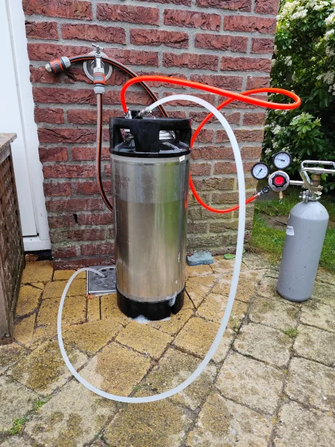 Natuurlijk hebben we de keg van te voren schoon gemaakt, gevuld met water met Starsan, en deze oplossing hebben we met een gasfles compleet er uit geduwd. De Corny Keg is dus in het begin helemaal gevuld met koolzuurgas.